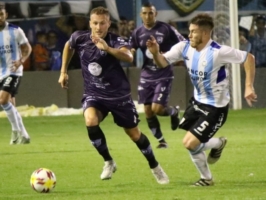 Facundo Soloa intenta recuperar la pelota ante Nicolás Sansotre.